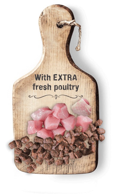Fresh poultry meat (30 %); Poultry protein, low ash, dried (27 %); Rice; Poultry fat; Maize; Poultry liver, hydrolysed; Rye, malted (3.8 %); Egg, dried; Whey powder; Marine zooplankton, ground (Krill, 2.5 %); Fish meal from seafish (2.5 %); Brewers’ yeast, dried (2.5 %); Chia seeds (1.3 %); Carob pods, dried; Dicalcium phosphate; Potassium chloride; Sodium chloride; Chicory inulin