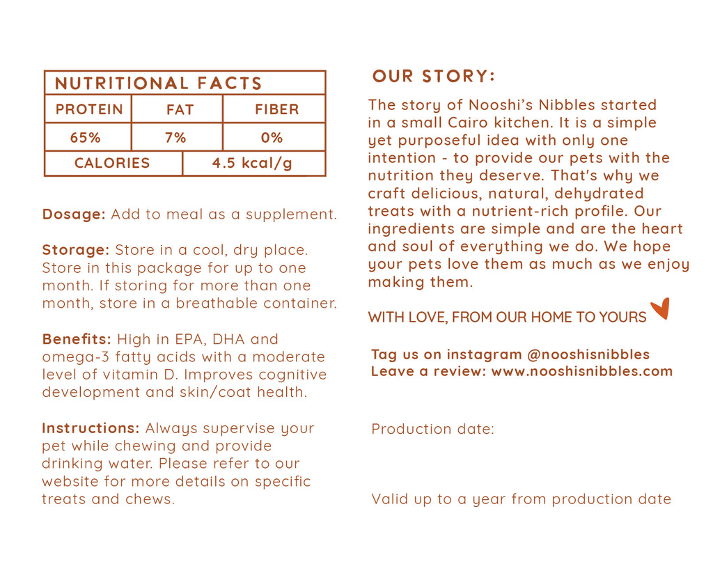 Wild sardine chunks are high in EPA, DHA and omega-3 fatty acids with a moderate level of vitamin D. Improves cognitive development and skin/coat health