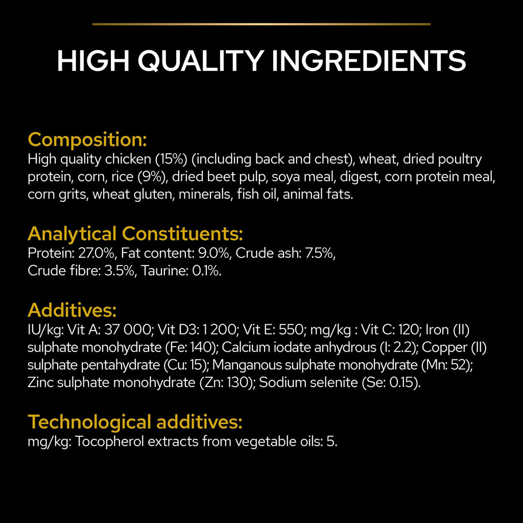 | Composition: Chicken (15%), Wheat, Dehydrated poultry protein, Maize, Rice (9%), Dried beet pulp, Soya meal, Digest, Maize gluten meal, Maize grits, Wheat gluten meal, Minerals, Fish oil, Animal fat, Vitamins, Aminoacids, L-Carnitine, Antioxidants (tocopherols of natural origin). |