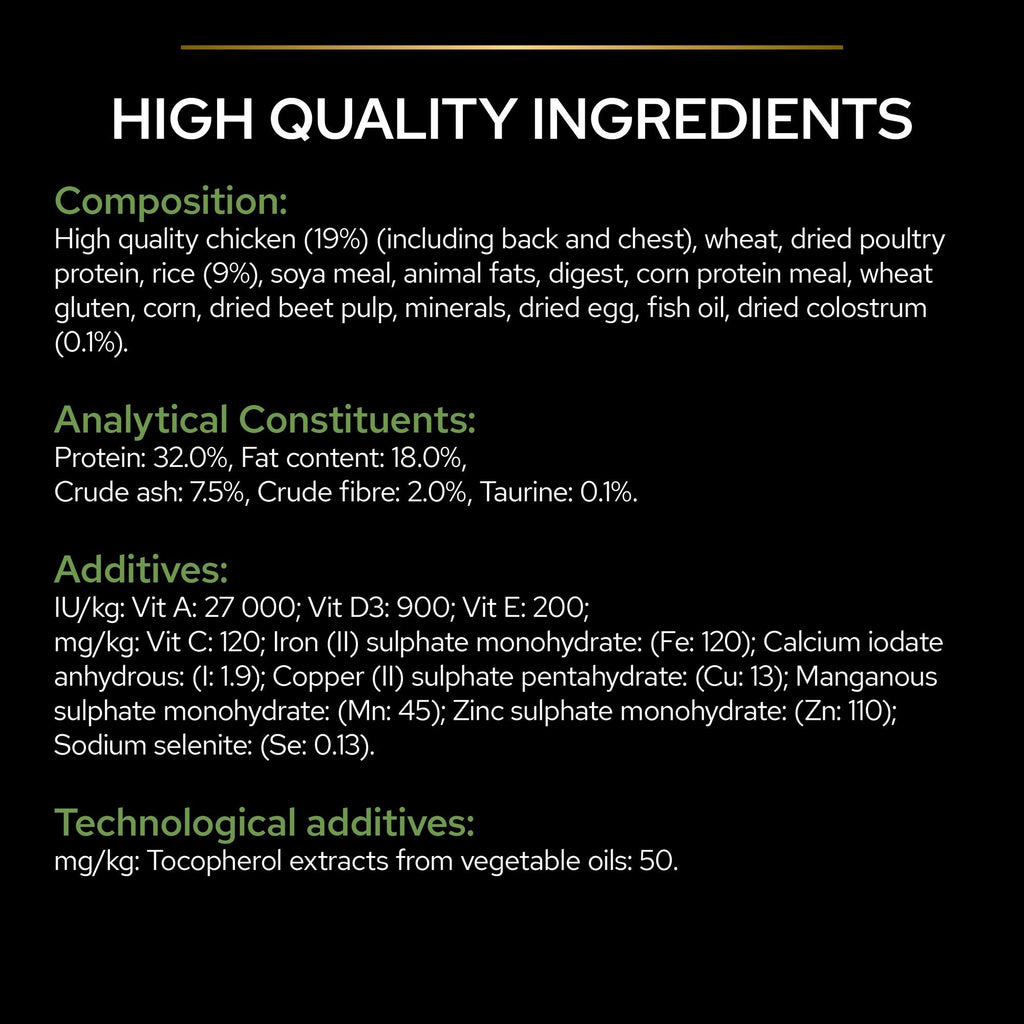 | Composition: Chicken (19%), Wheat, Dehydrated poultry protein, Rice (9%), Soya meal, Animal fat, Digest, Maize gluten meal, Wheat gluten meal, Maize, Dried beet pulp, Minerals, Dried egg, Fish oil, Vitamins, Dried colostrum (0.1%), Aminoacids, Antioxidants (tocopherols of natural origin). |