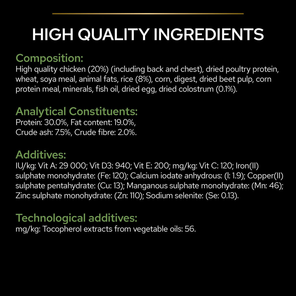 | Composition: Chicken (20%), Wheat, Dehydrated poultry protein, Animal fat, Rice (8%), Soya meal, Maize gluten meal, Maize, Digest, Dried beet pulp, Dried egg, Fish oil, Minerals, Dried colostrum (0.1%). |