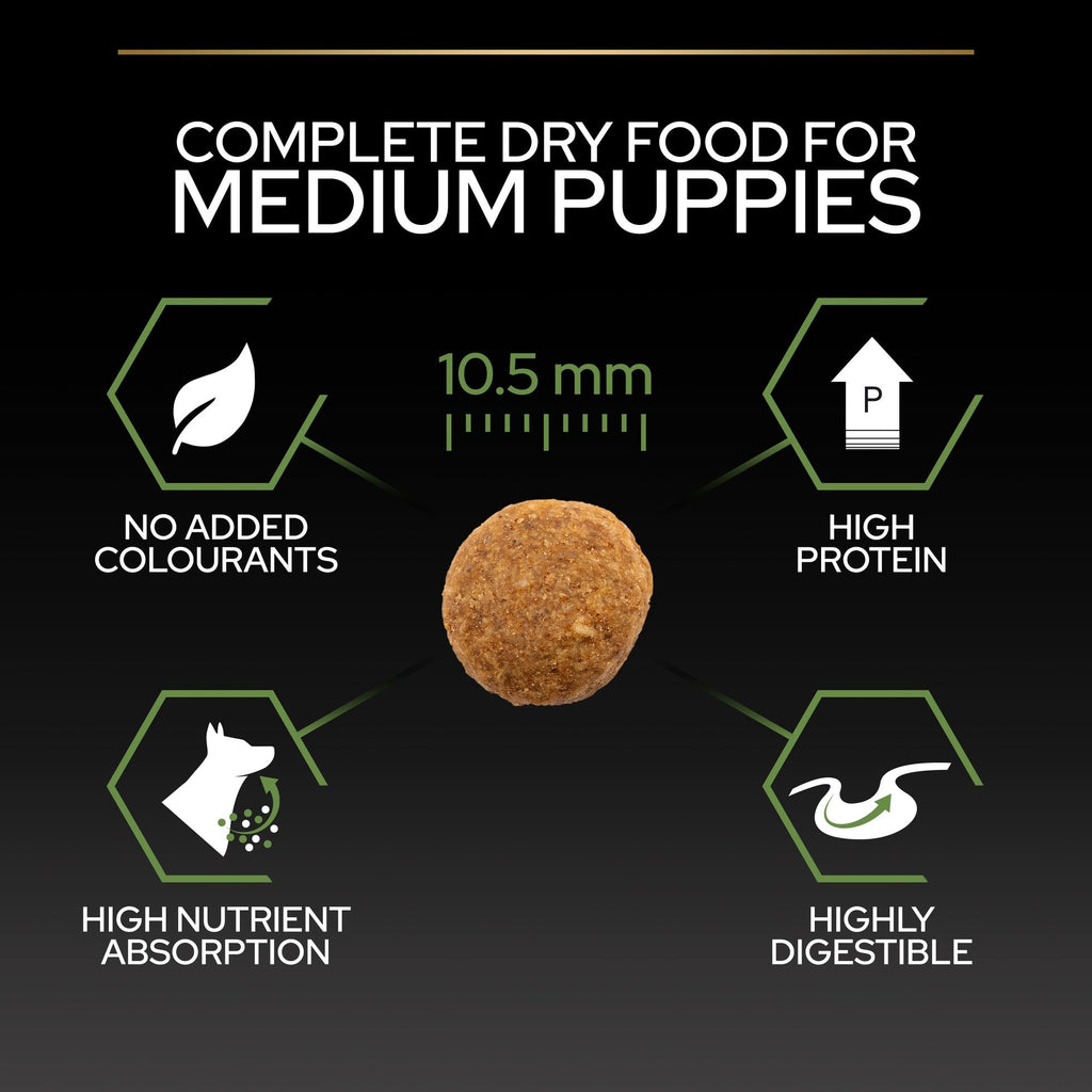 PURINA® PRO PLAN® DOG Medium Puppy with OPTISTART® is designed for medium-sized puppies, but it is also suitable for gestating or lactating mothers. It contains all the nutrients puppies need to help them grow into a healthy, happy adult. Rich in chicken and specially formulated by PURINA® expert vets and nutritionists, this dry puppy food provides complete nutrition at every meal. Our recipe contains OPTISTART®, which helps support their natural defences with a blend of essential nutrients. This complete dry puppy food has been specially formulated for dental care; it also helps support long-term health, joint health, and enables puppies' developing immune systems to react efficiently PURINA® PRO PLAN® DOG Medium Puppy with OPTISTART® also contains colostrum, found in mother's first milk. Made with high quality chicken, this complete puppy food will help support them all the way to adulthood.