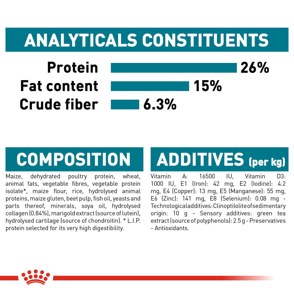 Maize, dehydrated poultry protein, wheat, animal fats, vegetable fibres, vegetable protein isolate*, maize flour, rice, hydrolyzed animal proteins, maize gluten, beet pulp, fish oil, yeasts, minerals, soya oil, hydrolyzed collagen (0.84 %), marigold extract (source of lutein), hydrolyzed cartilage (source of chondroitin).
