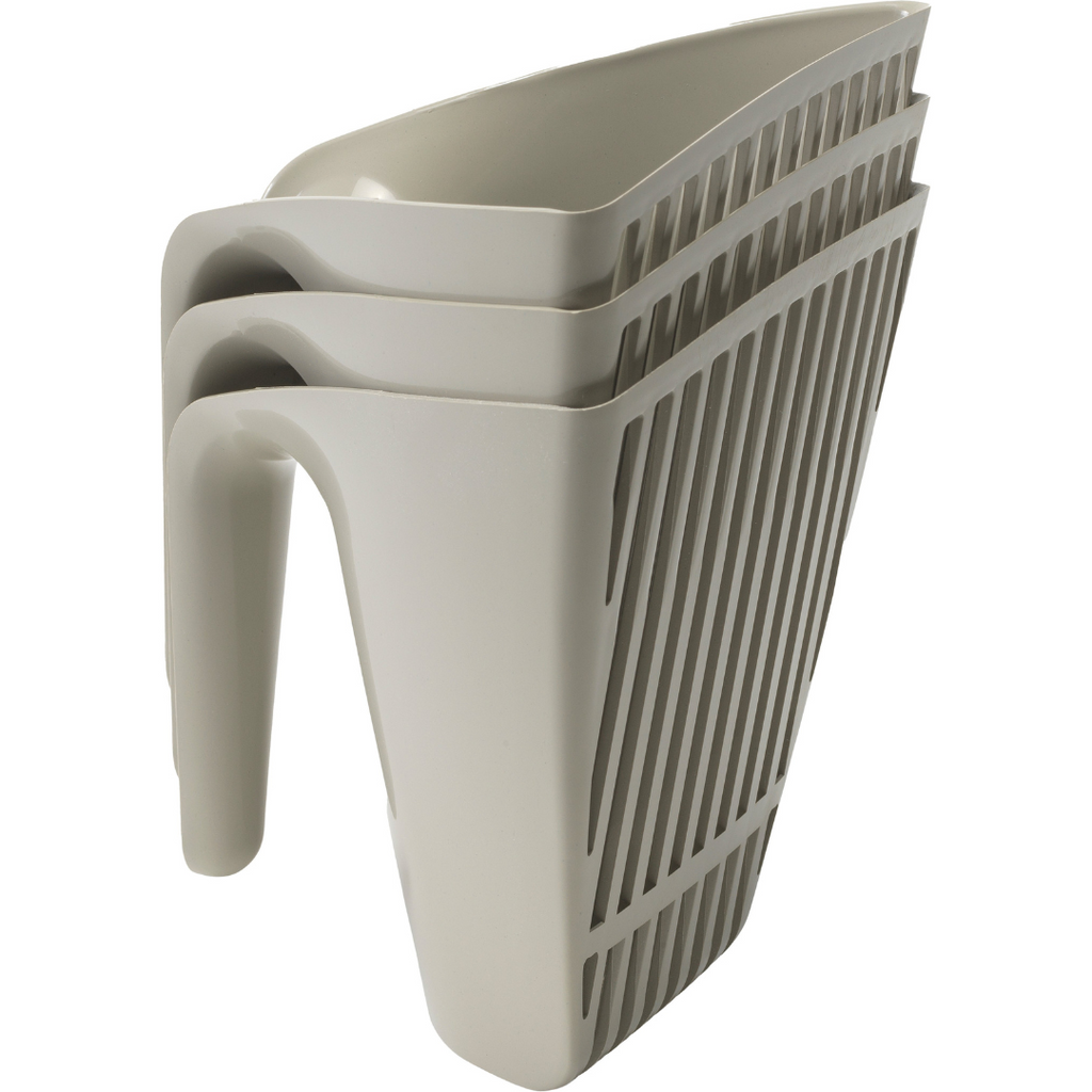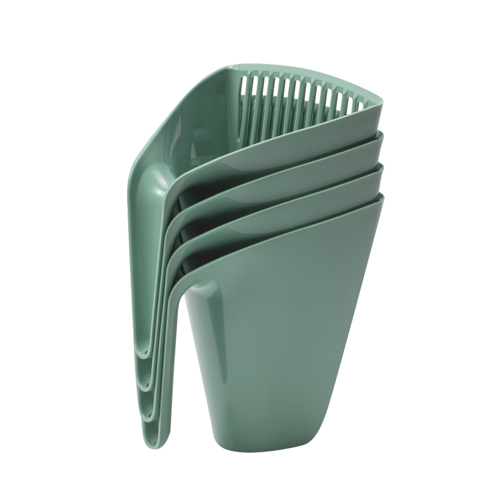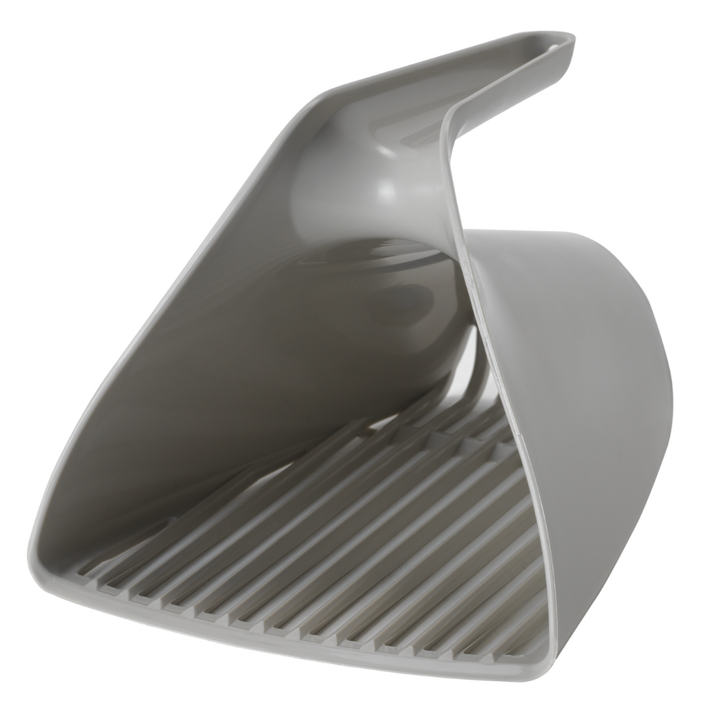 This is a modern, soft litter scoop with a unique bucket-shaped design. Its vertical slats allow for effective sifting and waste removal, while the ergonomic handle ensures a comfortable grip. Ideal for quick and hygienic cleaning of cat litter boxes.