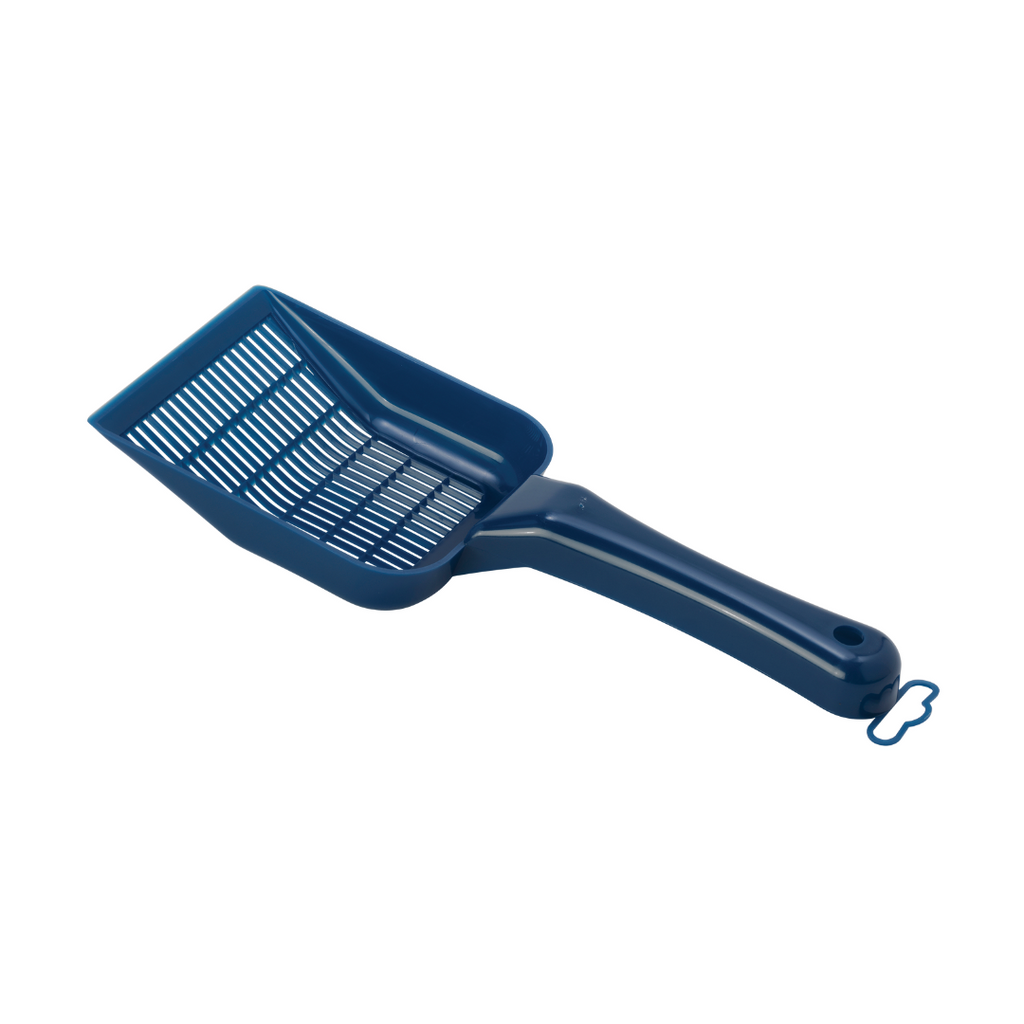 This is a durable plastic litter scoop designed for cleaning cat litter boxes efficiently. It features a sturdy handle for easy grip and slotted holes for sifting through clumping litter while removing waste. Perfect for maintaining cleanliness in pet areas.