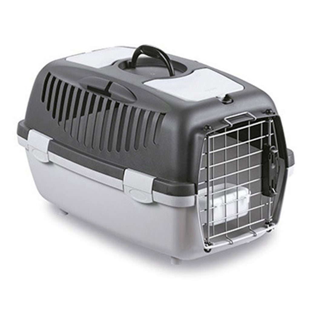 Practical and safe carrier for small sized pets, provided with: handle for transport, metal door with lock, water-basin and seat belts secure system. The 4 swivelling wheels set and the shoulder strap complete the product.