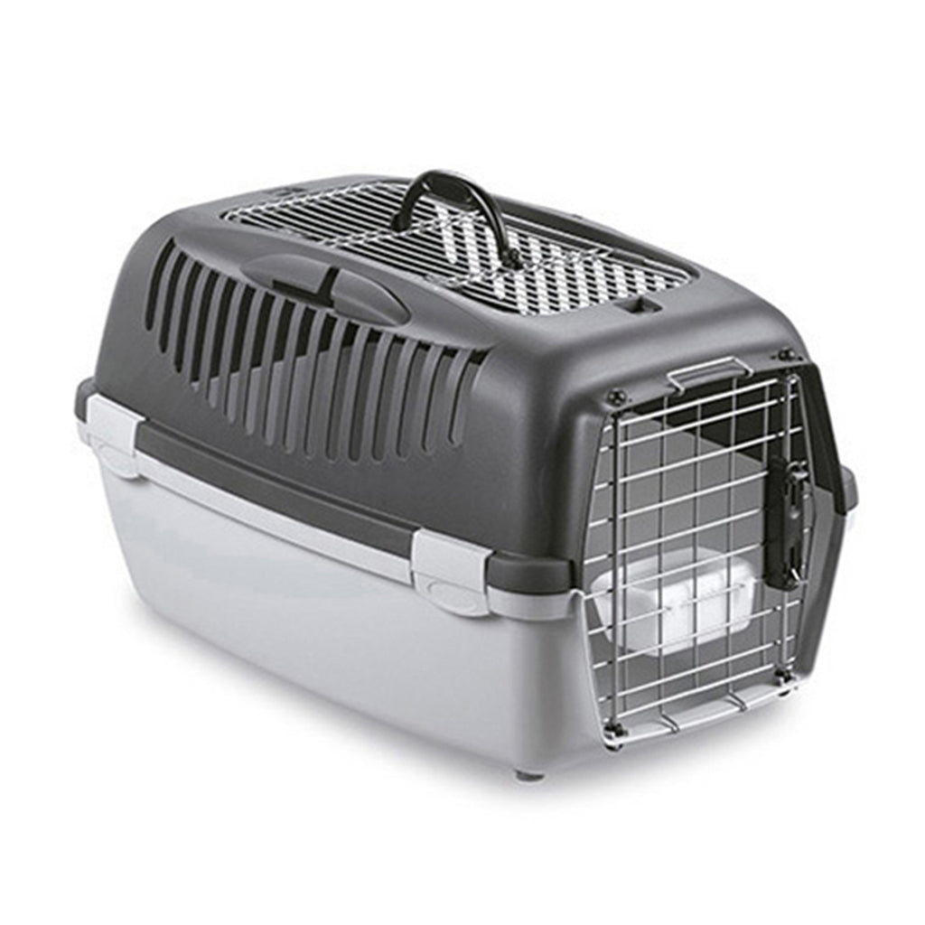 Practical and safe carrier for small-sized pets, provided with: handle for transport, metal door with lock, water-basin, and seat belts secure system. The 4 swivelling wheels set and the shoulder strap complete the product.